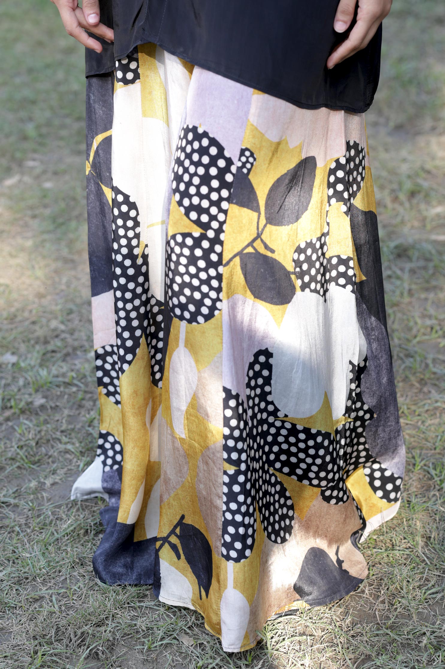 - Color: Black top, multicolor printed flared bottom
