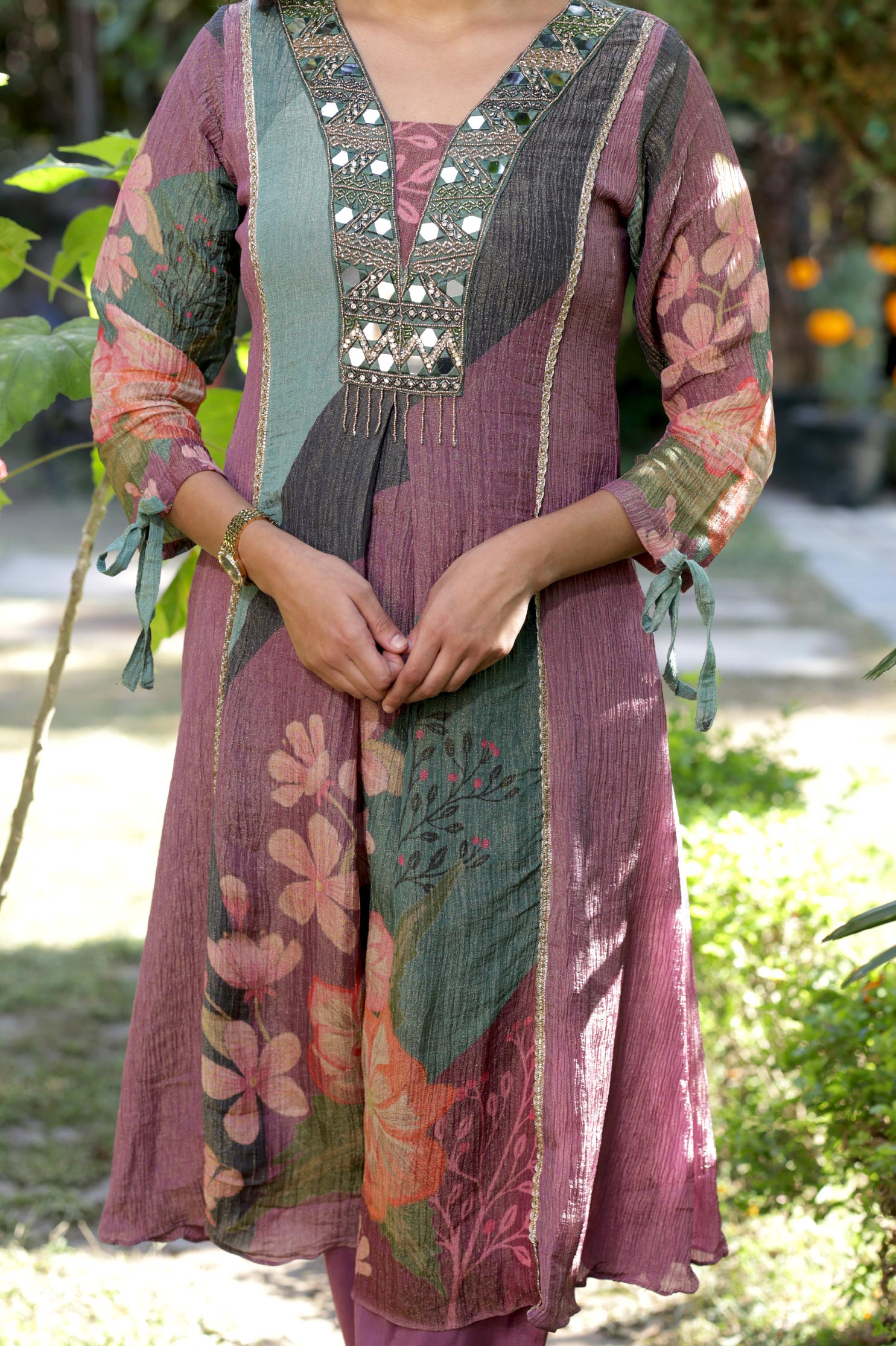 Design: Hand-embroidered mirror neckline, floral digital print, flowy A-line silhouette, matching solid pants & dupatta