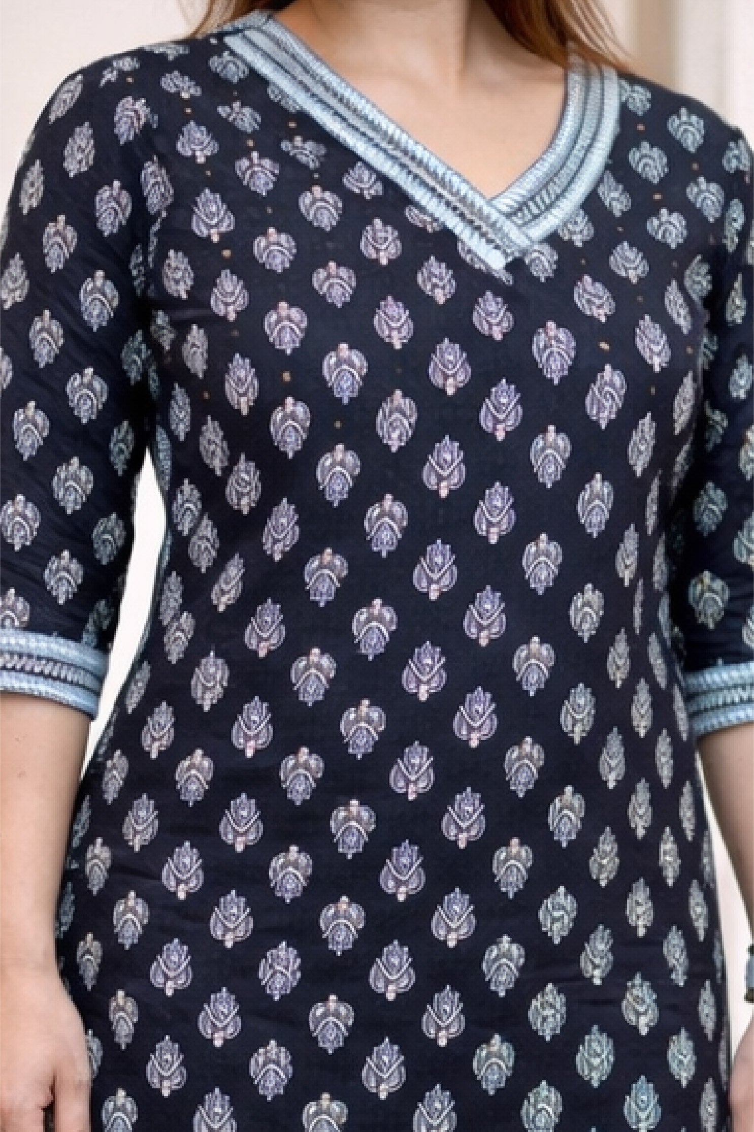 Elevate your everyday style with the serene charm of the Neelika Indigo Cotton Suit Set. Inspired by traditional handblock aesthetics, this 3-piece set features a kurta adorned with classic indigo motifs, paired with striped cotton pants and a beautifully coordinated dupatta.
