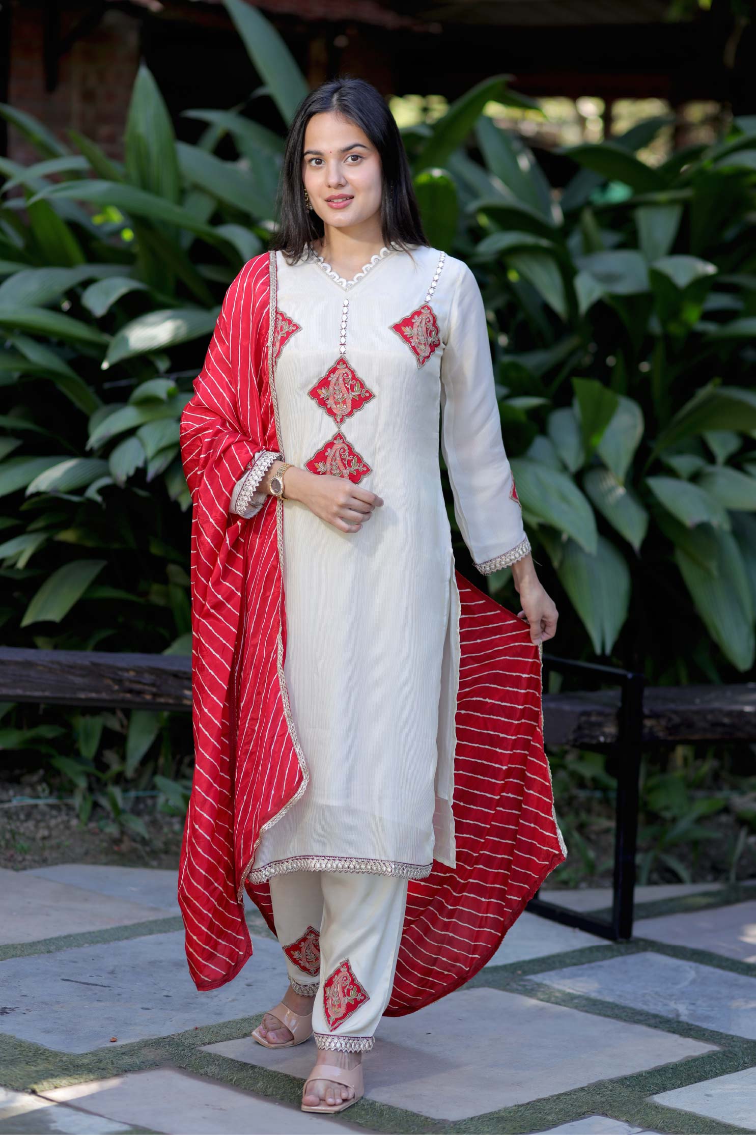 Color: Cream base paired with Crimson Velvet accents & embroidered motifs