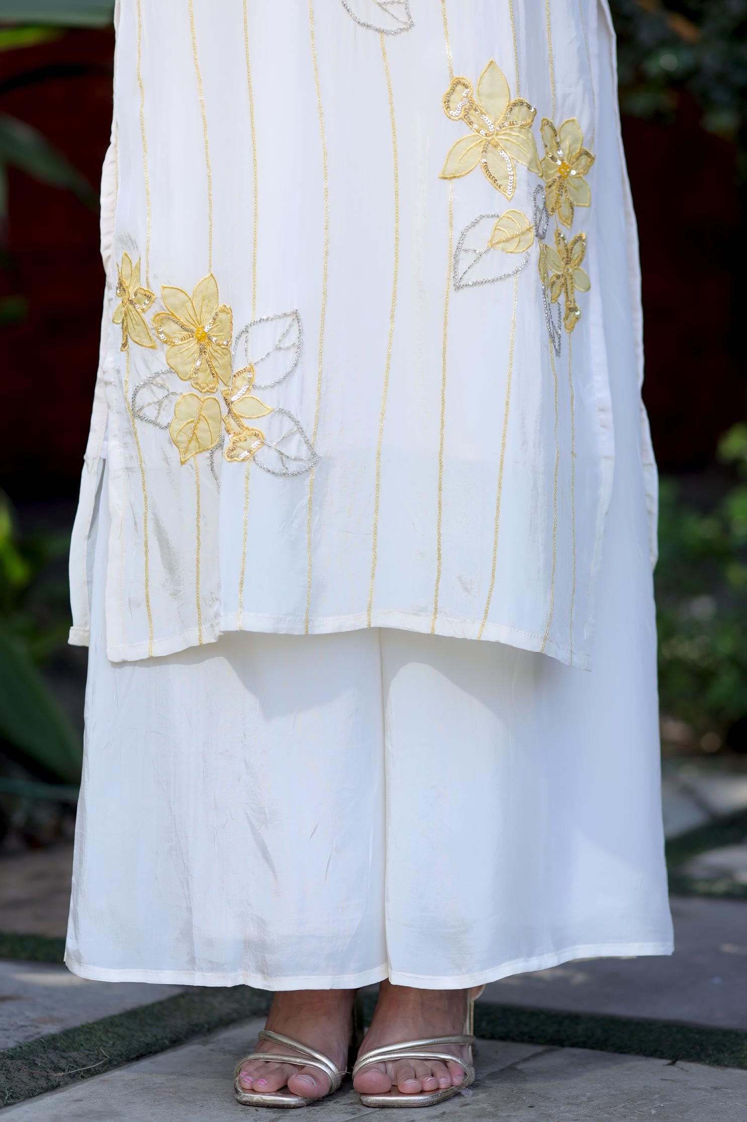 Set Includes: Embroidered kurti, wide-leg trouser and embroidered dupatta
